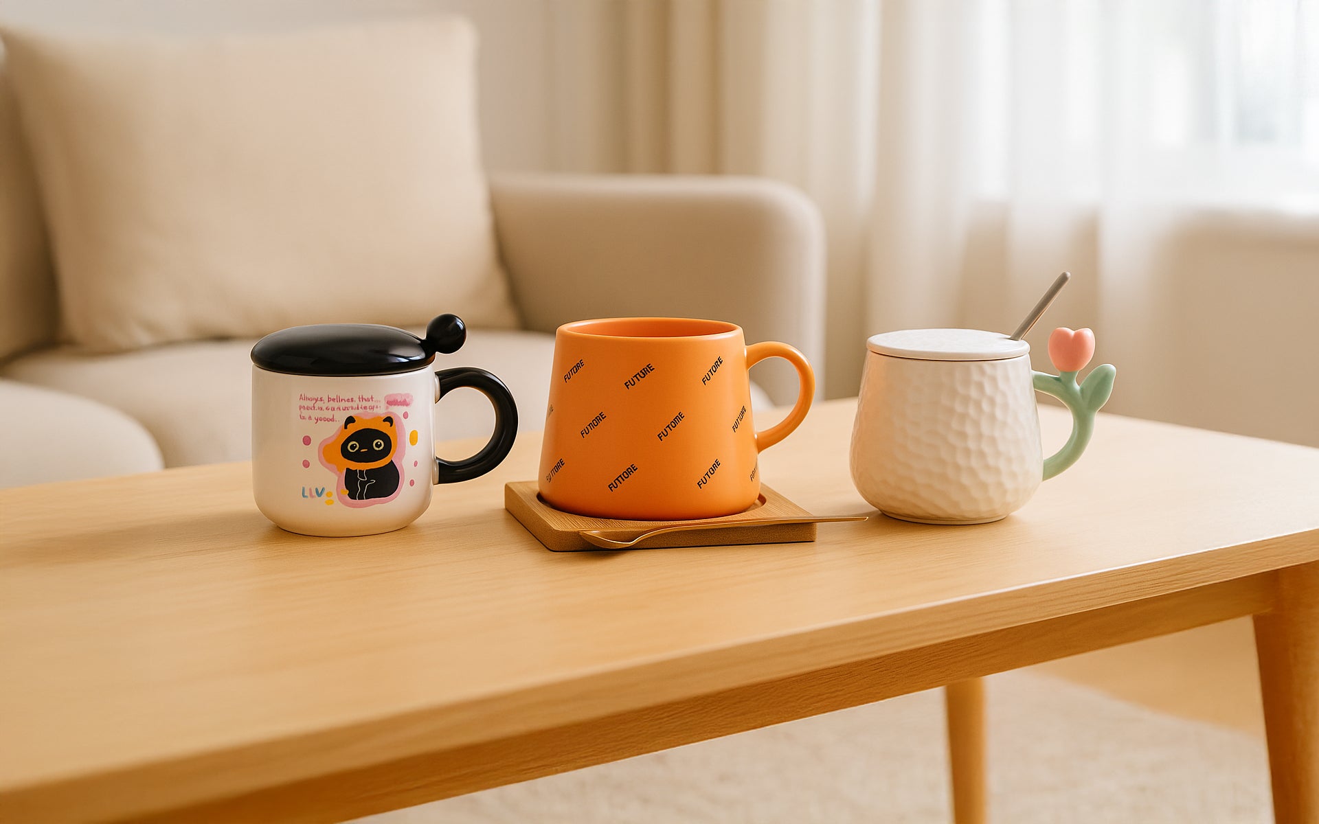 عندنا تشكيلة واسعة من الأكواب: سيراميك، زجاج، أكواب حرارية للرحلات، وأكواب مخصصة بالطباعة حسب طلبك.